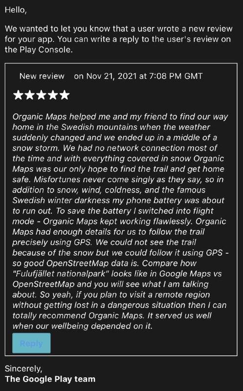 עדכונים ל-Google Play (https://play.google.com/store/apps/details?id=app.organicmaps) ו-FDroid (https://f-droid.org/en/packages/app.organicmaps/) זמינים גם הם. שימו לב שגרסת FDroid אינה הגרסה העדכנית ביותר, והיא קורסת עם מסלולי התחבורה הציבורית. התיקון צפוי להיות זמין בימים הקרובים. רשימת השינויים נמצאת כאן.