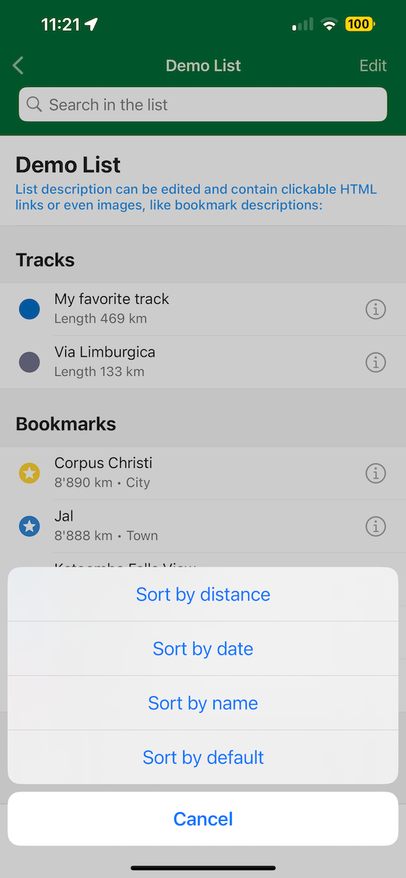כדי לייבא סימניות מ-MapsMe ומאפליקציות אחרות התומכות ב-KML/KMZ באנדרואיד, פתח את תפריט הסימניות בסרגל הכלים התחתון ולחץ על כפתור הייבוא. ייבוא אוטומטי מ-iOS אינו אפשרי מבחינה טכנית, ולכן הנה מדריך קצר
